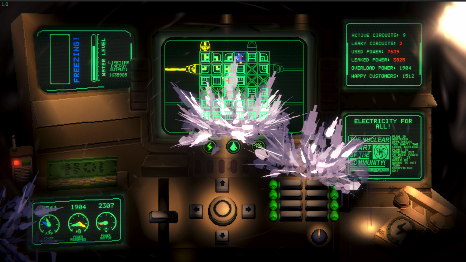 While the electricity is flowing, you need to manage the water flow to cool down the reactors, and tinker with the reactor pins to optimize your energy throughput. Every tweak and change you make to the system will solve one problem and create two more!